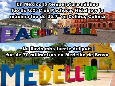 En México, la temperatura mínima fue de 6.2º C en Pachuca, en tanto que la máxima fue de 36.7º. La lluvia más fuerte del país fue de 70 milímetros en Medellín de Bravo.
